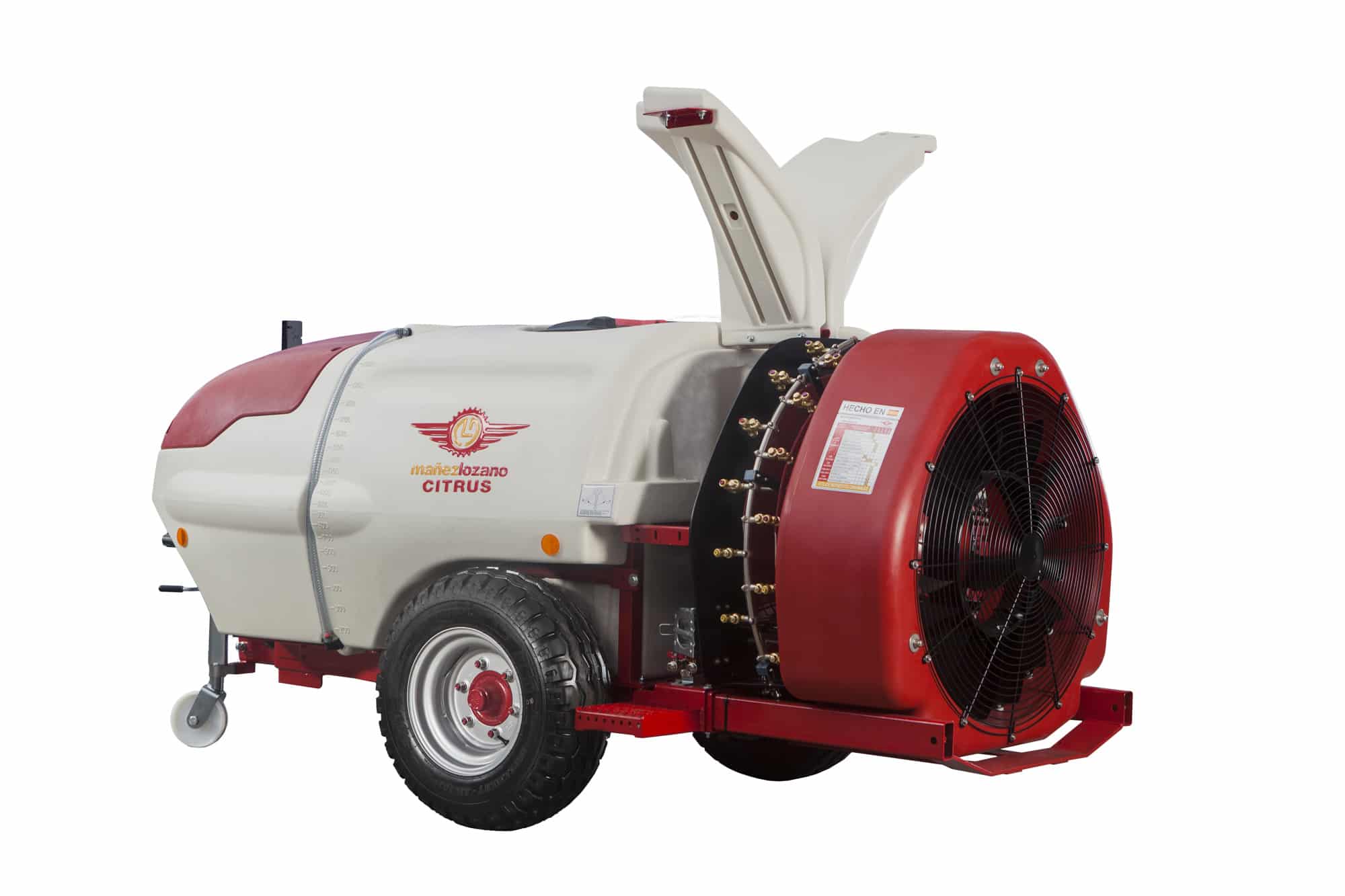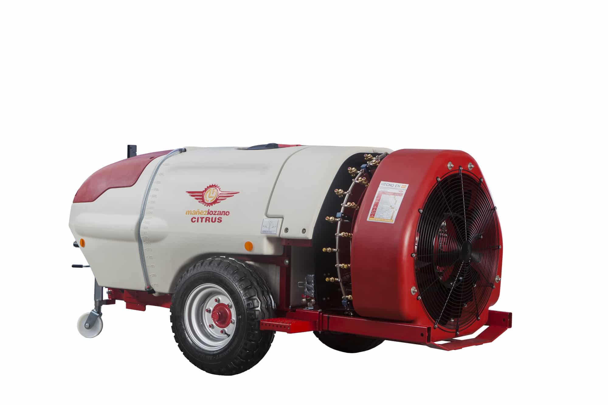 Trailed sprayer with double row of nozzles and triple air channel, for crops with important cup density, such as citrus.