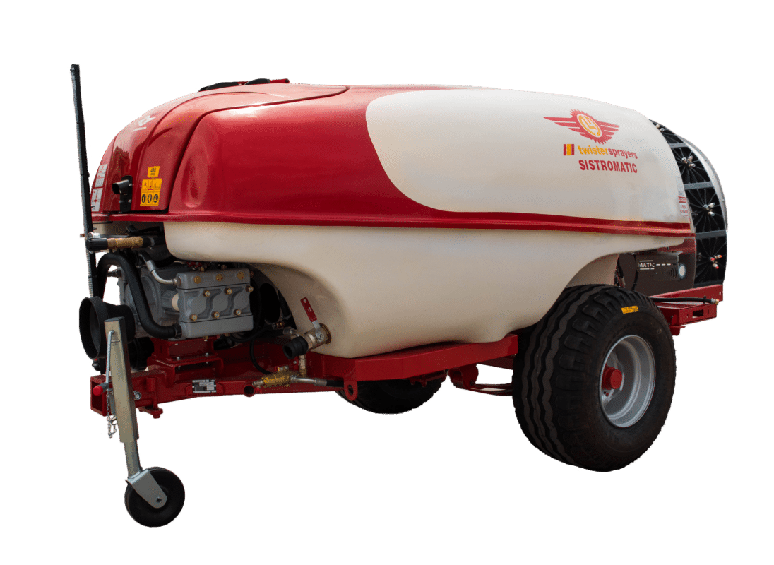 Pulverizador rebocado versátil, projetado principalmente para fazendas de frutas cítricas e frutíferas, com larguras de entrelinhas mais estreitas. Incorpora o sistema twister spray, ganhando eficiência.​